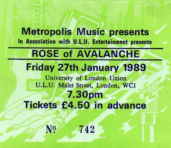 Rose of Avalanche was the first gig I went to in 1989 – which was the year which really saw me explode on to the gig scene (I’d seen 1 gig in ’87, 5 in ’88 and 1989 would go on to see me go to 27 gigs – which wasn’t the most in a year by any means – I think that was 1995 when I went to a massive 65 concerts!). It was also the first time that I saw a band for a second time, as I’d seen Rose of Avalanche the previous year supporting Ghost Dance.