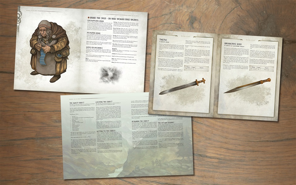 The Beowulf: Age of Heroes RPG from Handiwork Games, is a lovely looking book that is also a great setting and game. Using the 5th Edition system it’s one of a few games that focuses on a two-person experience – with one Game Master and one Hero (although you can still play more traditional group play if you wish). This ‘duet game’, as they call it, allows greater focus on the Hero and their followers, and also encourages journaling between games to further flesh out the saga that is being written.