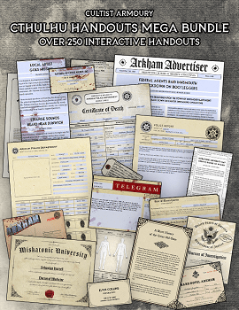 The Cthulhu Handouts Bundle is an interactive handouts bundle with more than 250 handouts for Horror or Lovecraft-based roleplaying games. The props, documents and artwork in this pack are inspired by the works of H.P. Lovecraft but do not refer to any specific game system, and are useful in any game situation where a period item from the 1920s – 1940s is needed. It includes the following handouts: