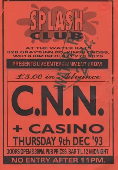 Formed in 1992 by David Tomlinson (vocals), Tim Bricheno (guitar; ex-All About Eve/Sisters of Mercy), and Neill Lambert (drums) CNN was a band that I’d been following for the last year and had picked up all the singles they’d released to date. I was really keen on seeing them live so when they played the Water Rats in King’s Cross I snapped up my ticket and headed down to stand around in the backroom of a pub to waiting for them to come on.