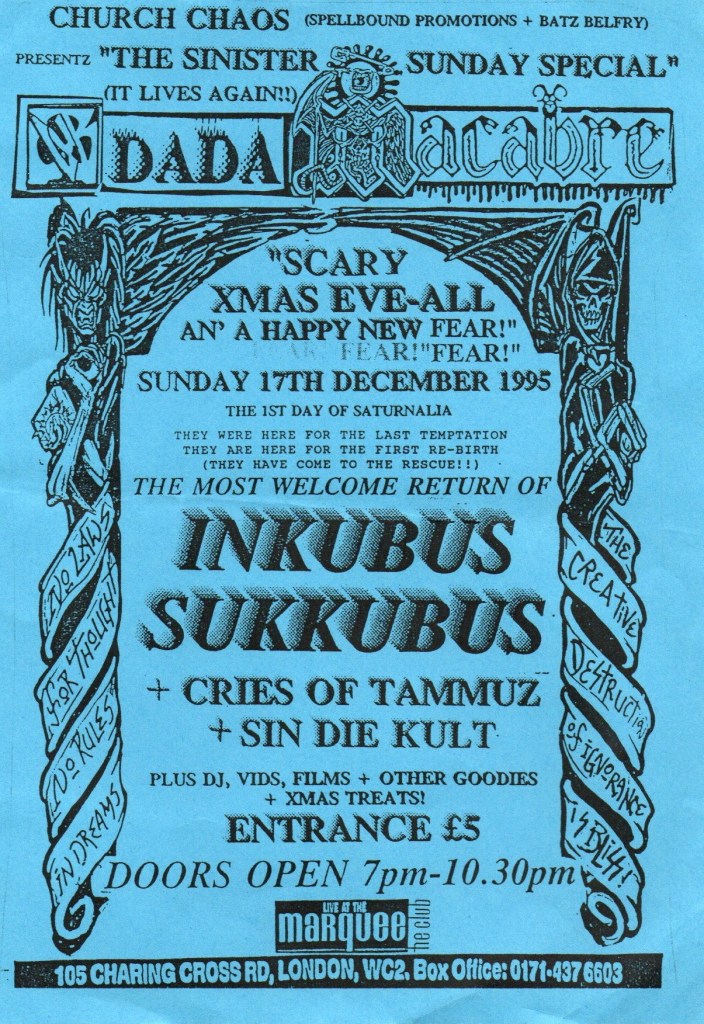 A week before Christmas and a last trip to The Marquee for 1995, once again to see Incuibus Succubus and Cries of Tammuz on the same bill. This time joined by Sin Die Kult, a band I hadn’t seen before.