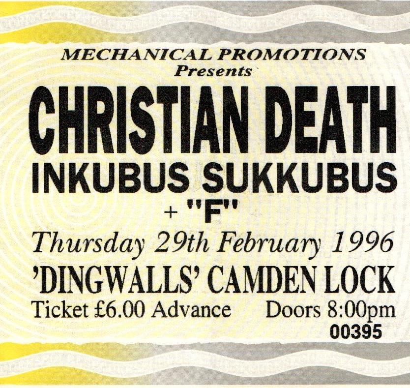 I was primarily attending to see Inkubus Sukkubus (who had mysteriously transformed from using ‘c’ to ‘k’ in their name at somepoint in the last few months) but Christian Death and f were also playing.