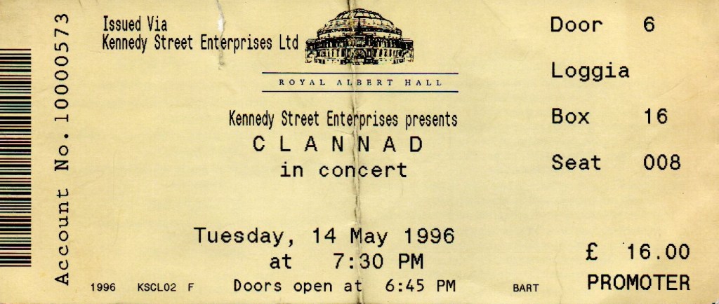 I’d seen Clannad twice before, both in 1989, the first of which (GIG 014) was also at the Royal Albert Hall the day after my birthday. Now seven years later I was back at the Royal Albert Hall, two days before my birthday, to see them again.