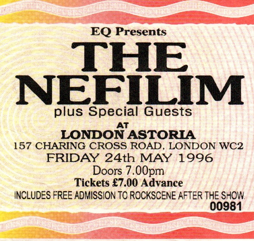 This was a gig I’d been waiting for since The Fields of The Nephilim split in 1992. Carl McCoy, the singer of Fields of the Nephilim went on to form The Nefilim in 1993 but, apart from a handful of dates in Germany in 1993, had never really toured – and had never played Britain with his new band. This changed in 1996 with the April release of The Nefilims sole album, “Zoon”, and a string of UK dates in May and a handful of festival appearences in June and July around continental Europe. They then split up with Carl going on to reform The Fields of the Nephilim again with new bandmates. So this was their one and only UK tour as The Nefilim, and turned out to be the only time I’d see them in this guise.