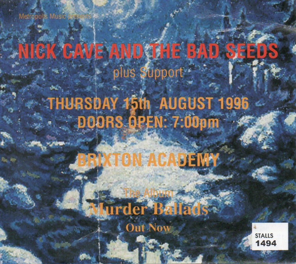 Melissa, my girlfriend at the time, was a massive Nick Cave fan… moreso than I was at the time, and I really liked him so you can guess how much she did. We arrived at Brixton Academy on this sunny Thursday evening in time to see the support, Dirty Three – an Australian instrumental band consisting of Warren Ellis (who has collaborated with Nick Cave on a host of albums and movie/TV soundtracks), Mick Turner and Jim White. I knew nothing of them at the time, although their 1996 album “Horse Stories” went on to be voted as one of the top three albums of the year by Rolling Stone magazine. I thought they were ok but they didn’t blow my socks off.