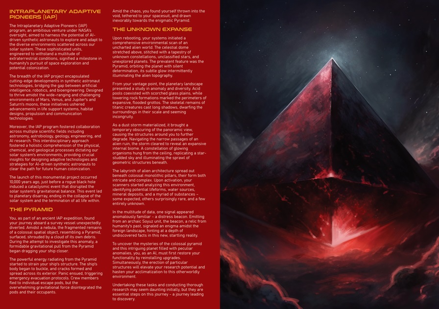 From the mind behind the 2022’s Silver Bestseller, “Campfire Story”, hails a new chapter in solo tabletop gaming. Prepare to embark on an epic hard Sci-Fi journey, one that transcends the boundaries of known space and delves into the mystery of a long-lost civilization. A chilling odyssey teetering on the edge of the unknown, an exploration of the extraterrestrial, and a testament to the indomitable spirit of discovery… brace yourself for an experience that’s out of this world.
