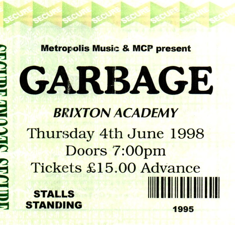 Garbage had just released their second album, “Version 2.0”, just three weeks earlier and were on the road to support it. This Brixton gig was the first night of their UK leg, supported by a new US electronic act The Crystal Method who had released their debut album, “Vegas”, the previous summer. I’d not seen either band live before so was keen to see both.
