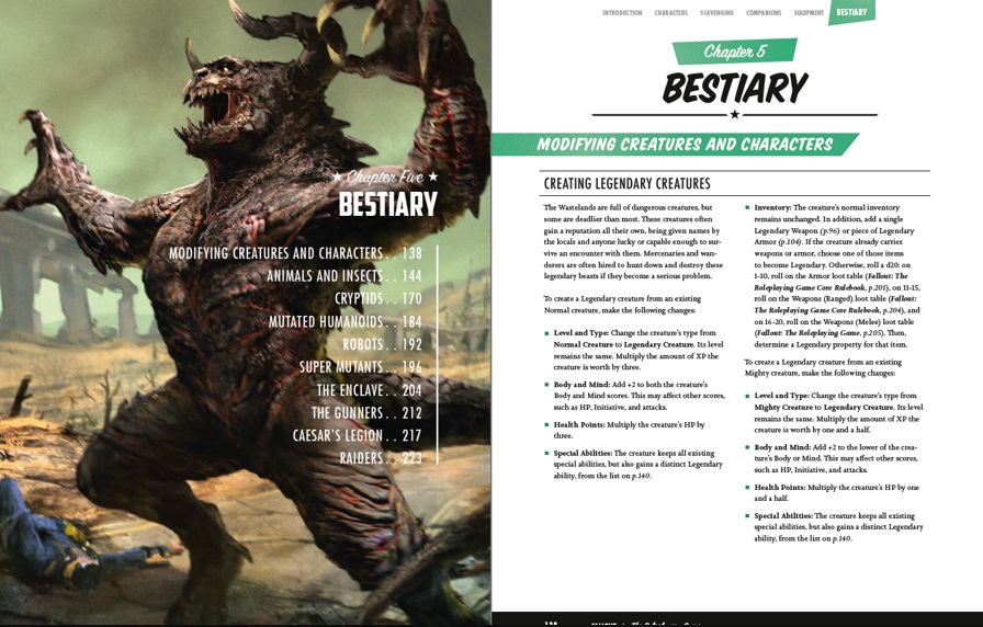 The Wanderer’s Guide Book includes a wealth of content for both players and gamemasters. If you want new character origins, perks, and equipment, you’ll find them here. If you want quick and easy scavenging locations, look no further! But watch out for the expansive bestiary full of creatures and factions that make the wasteland so dangerous.
