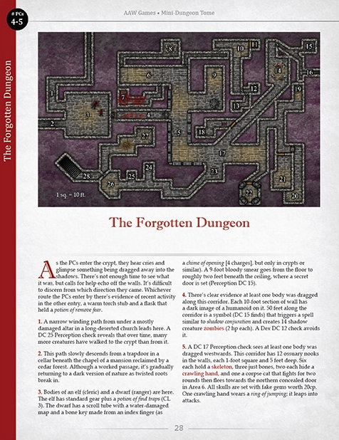 Themed and organized for convenience, the Mini-Dungeon Tome provides setting-neutral fantasy adventures suitable for every party level and size. With all reference material included in a convenient index, this single book holds everything you need for years of adventuring.