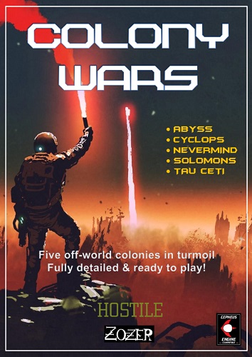Worlds in Turmoil in the HOSTILE Setting! For HOSTILE and Cepheus Engine RPG rules, this 174-page roleplaying supplement provides in-depth descriptions of five colony worlds from the Near Earth Zone: Abyss, Cyclops, Nevermind, The Solomons and Tau Ceti. Each section includes maps, NPCs, plots and scenario hooks, a description of factions at play, local wildlife, equipment and vehicles used on that world, and a summary of the conflicts raging on that world. There may be a guerrilla war, a Cartel take-over, corporate sabotage or a local rebellion. Life is never dull on the off-world colonies.