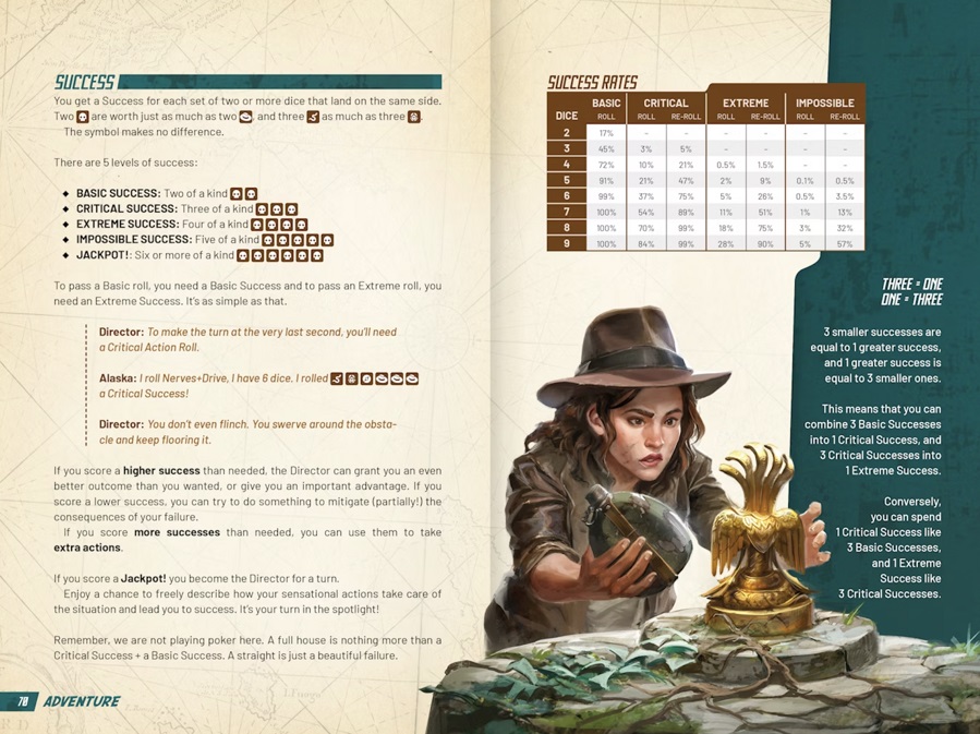 Outgunned Adventures features a game system called Director’s Cut, a set of mechanics using small pools of six-sided dice to determine the outcome of the Adventurers’ actions. When rolling dice, your goal is not to score the highest or lowest possible number, but to roll two-, three-, and four-of-a-kind.