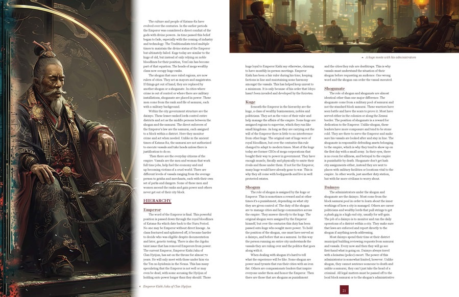 The largest exploration of the Katana-Ra game universe to date, the World Book is a campaign setting revealing completely new detail on the world, its inhabitants, its nuances, and more – with the depth you need as a Player or Game Master to immerse yourselves thoroughly in this amazing universe.