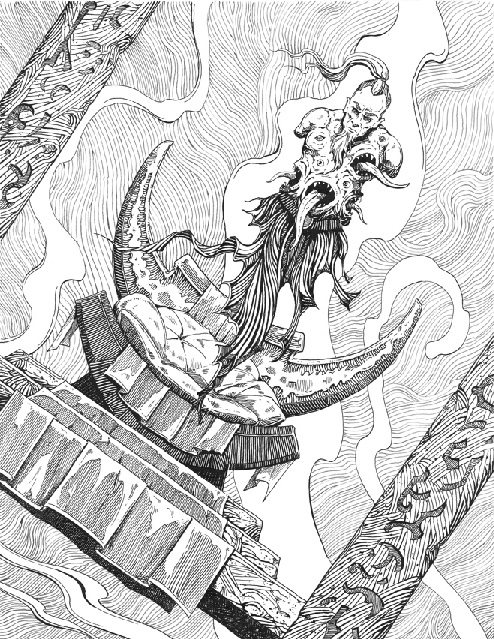 This second volume begins with the heroes returning to Kangkul after dealing a fatal blow to Ashuraga in the Tower Vartoriak. In “Diggers of Dul’ghuun,” the adventurers rest in a popular tavern called The Beating before heading off on their next adventure, but while therein, a small group of ravenous undead emerge from the tavern’s cellar and attack the patrons. After the party destroys them, they discover a tunnel into the caverns below the establishment. The heroes reach the massive stone doors of an ancient dwarvish citadel called Mimnohgrod and must explore its depths to determine how this attack occurred.