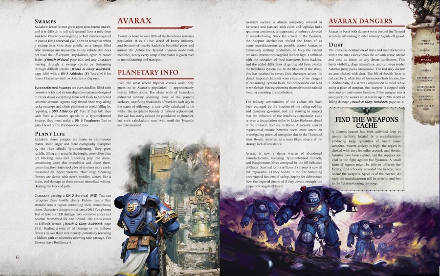 - New hazards from the planets of Kadaku, a lethal death world made all the more terrifying by invading Tyranids and Avarax, a chaotic urban sprawl slowly being lost to the insidious influence of Chaos, two of the key locations from the game.