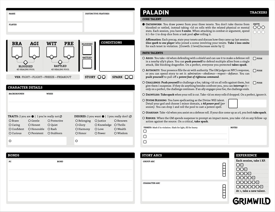- Solo Play: Guidelines for solo play, which works wonderfully in Grimwild by default, and the solo party mode where you take on the role of the main PC as well as three secondary characters to form an entire adventuring party! Complete with its own character sheet to track each of the secondary party members, who have lightened mechanics to make it easy.