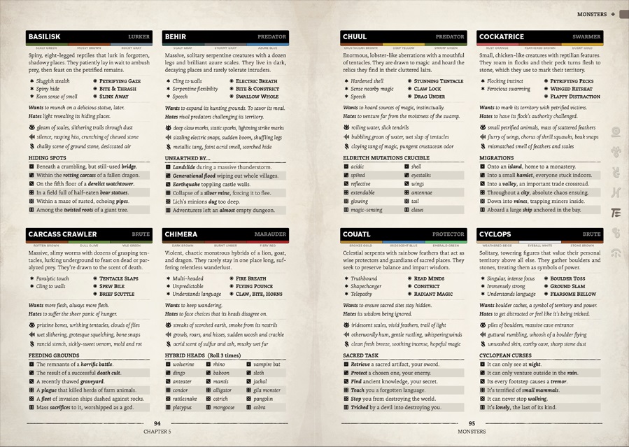 - New Take on 100 Classic Monsters: We detail and give advice on creating encounters that make the monsters a part of the story, not just meatbags of hit points to chew through.