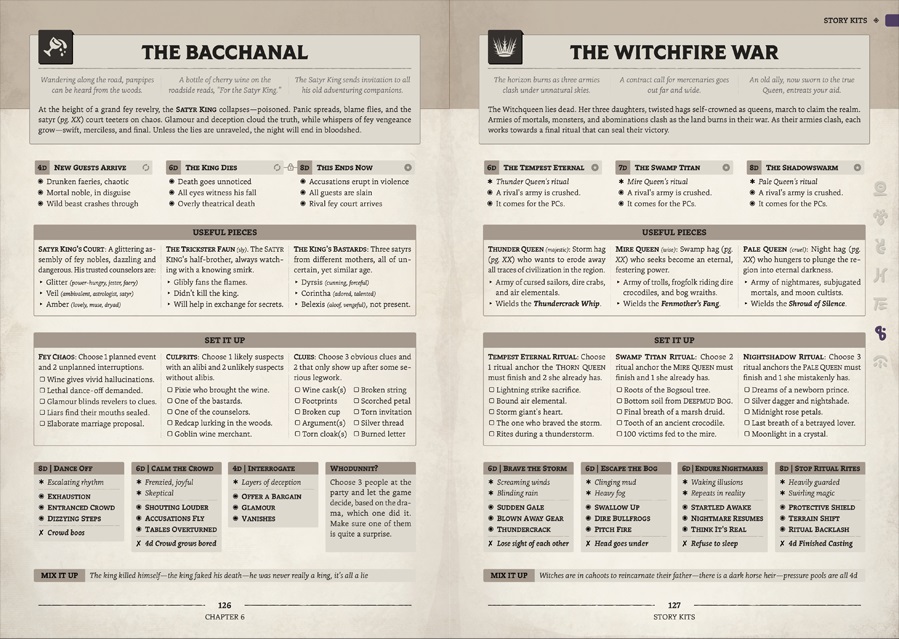 - Enemy Tactics: Positive and negative traits, example moves, motivations, and worst case scenario tables for all combat roles to help create diverse combats on the fly.