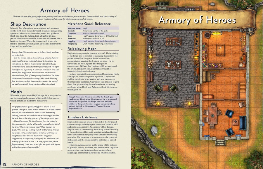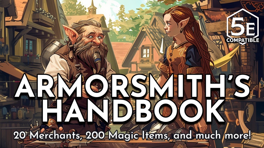 In the Armorsmith’s Handbook, we’ve detailed 20 engaging shop owners with a unique inventory of magical armors, shields, and wondrous items. In addition to the magical wares that your player’s want, we’ve included some content to help Game Masters spruce up their shops!