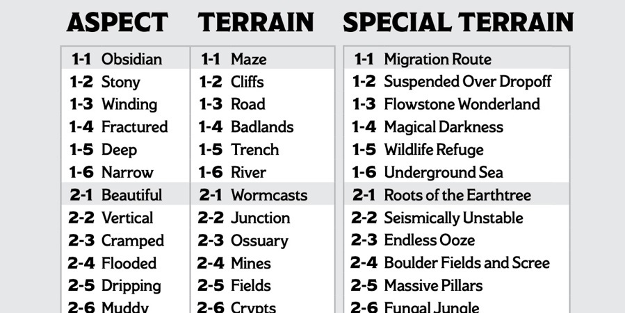 - Inspiring Tables help you generate everything from ad-hoc story hooks to random locations to underground terrain types: