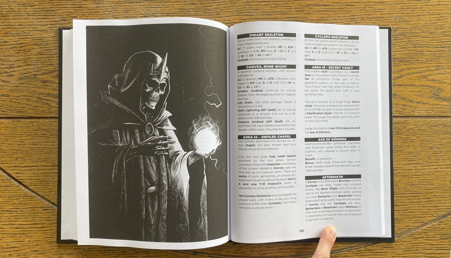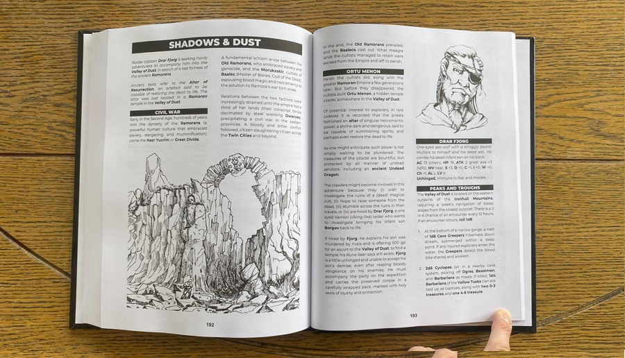 The book consists of twenty two short, sharp, independent adventures, designed for low prep, improvised play. Each adventure has a hook/rumours, core scenario, random encounters, NPC details, and B&W illustrations. Nineteen have hand drawn maps. The settings are common locations such as cities, forests, mountains, underground, etc, for easy insertion into your sandbox campaign. They’re suitable for PC Levels 1-7 and generally run around six to ten hours of session time.