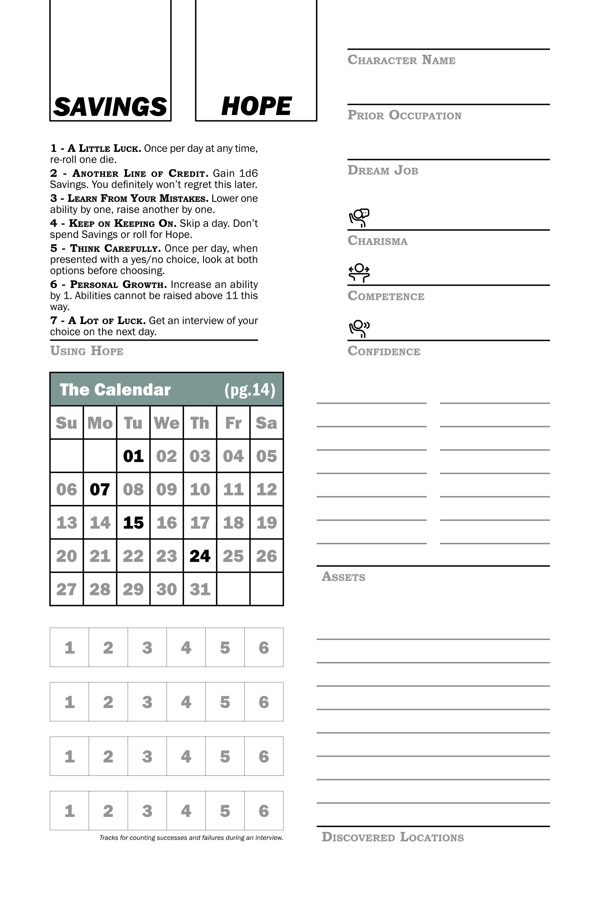 When you end up in a sticky situation, there’s always Hope. An expendable, fleeting resource, Hope can be used to grow as a person, nudge your luck in the right direction, or even find a little extra cash in a desperate moment.