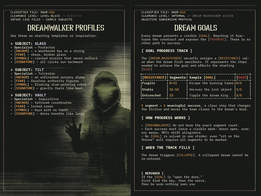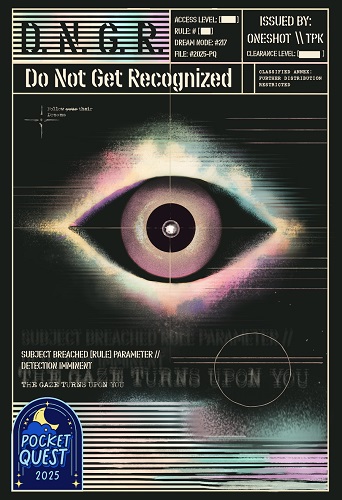 D.N.G.R. – Do Not Get Recognized is a one‑session, rotating-GM tabletop thriller where you and your friends dive head‑first into one another’s dreams, hunting for shattered fragments of humanity’s last hope. Each dream is a different world, built from your fears and imagination, and held together by a single secret rule of your design that must never be broken. Act in a way that contradicts the dream or mention the wrong word and the Gaze turns upon you.
