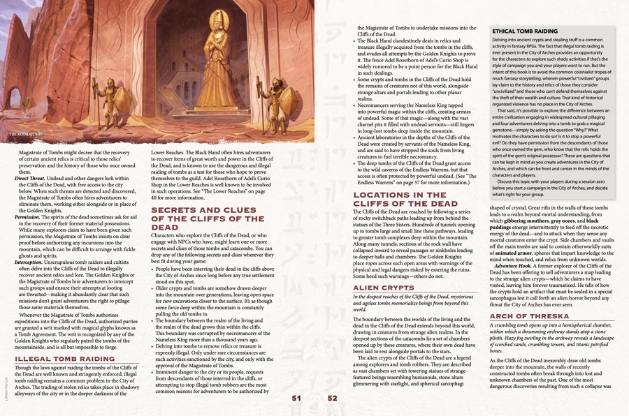 - Nine regions of adventure, including the City of Arches, the Lower Reaches beneath the city, the Cliffs of the Dead that stand above it, the deeper catacombs of the Endless Warrens, the ruined city of Sunken Revvia, the three regions of the Borderlands near the city (the Revlend Marshes, the Doorish Hills, and the Deadlands), and the lost and secret Vaults of the Nameless King.