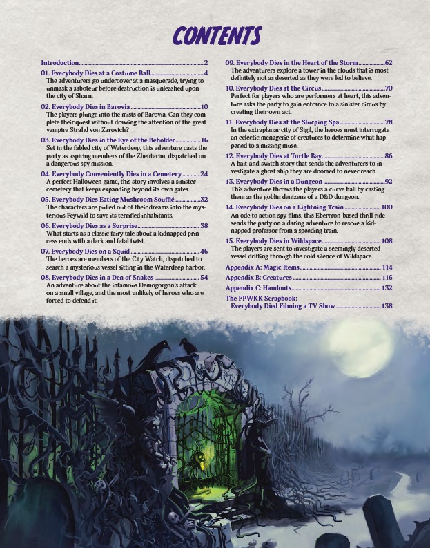 Every new group of 1st level adventurers dreams of a long adventuring career, full of daring victories and noble glory. But what about the ones that don’t make it? For every lucky hero there are a dozen unfortunate ones who open the wrong door, take on the wrong quest, or challenge an epic monster far beyond their abilities. Everybody Dies, Vol. 1 is your chance to live those courageously tragic lives… for an hour or two.