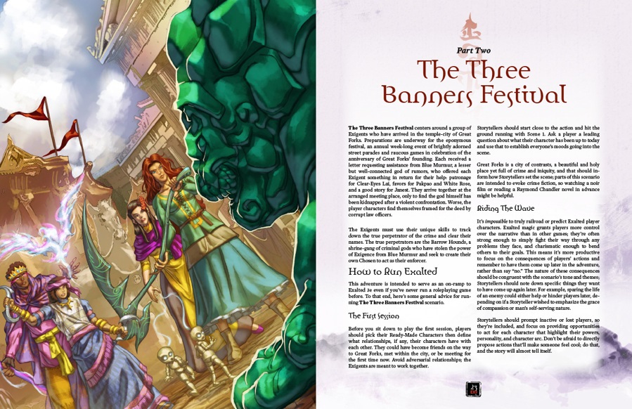 The Three Banners Festival is an Exalted Third Edition Jumpstart for Exigents, chosen of the small gods. Four Exigents from across Creation have been drawn to Great Forks, a holy city ruled by gods made prosperous through iniquity, by letters from the god of rumors Blue Murmur. Yet, before they can meet their patron, a horrible crime occurs — leaving the Exalts framed.