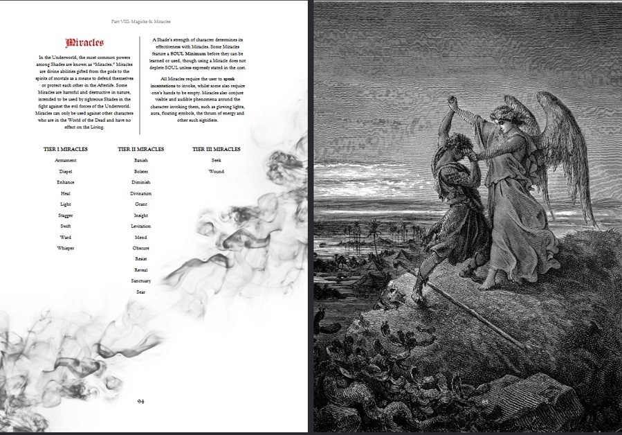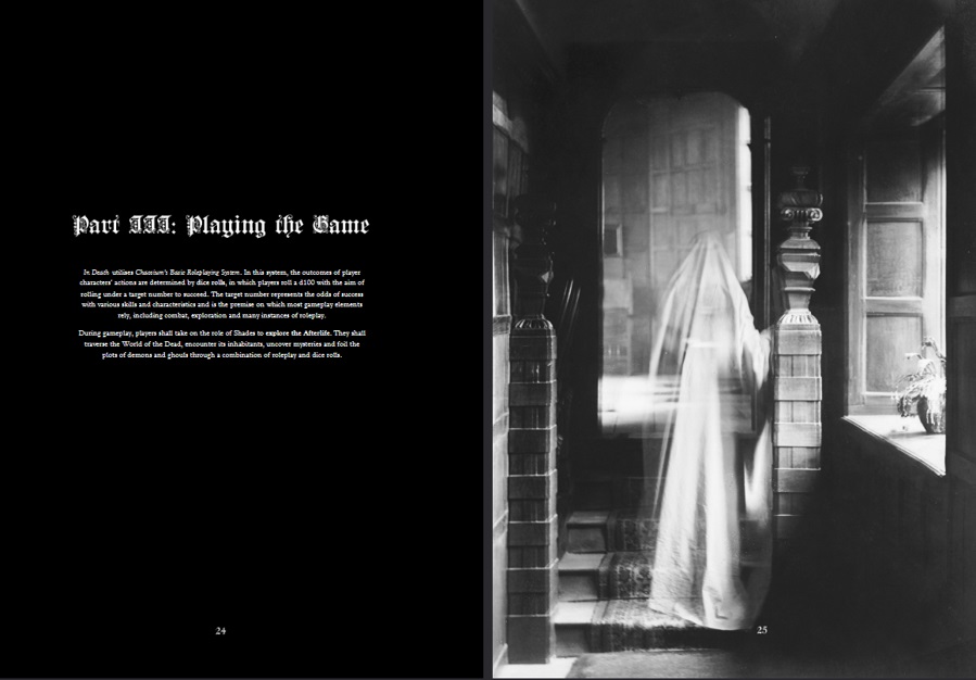 In Death is a tabletop roleplaying game about what becomes of the deceased. Play as ghostly Shades traversing the Afterlife, from the Dusk – a mysterious reflection of the World of the Living – to the Underworld – a desolate wasteland where the spirits of ancient beings rule over the souls of mankind. Haunt the Living, converse with the Dead, clash with cruel demons and negotiate with callous angels.