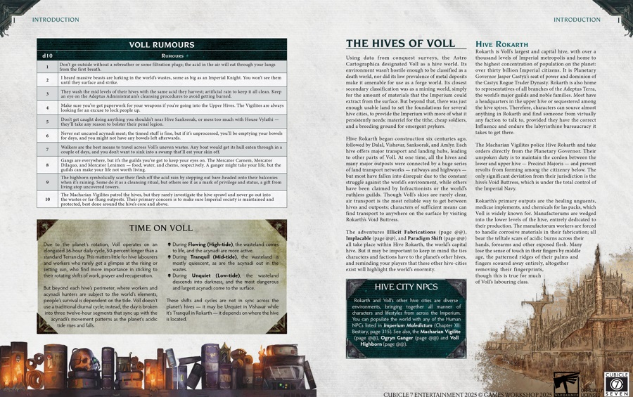 In the shadow of Macharia and Persepolis lies the world of Voll, a hive world run by an ancient Rogue Trader Dynasty and a cutthroat highborn caste. Every day, citizens toil in their hive cities to fulfil the Imperial Tithe, caught between the guilds and the gangs, while at odds with the world’s dangerously acidic atmosphere and hazardous conditions.