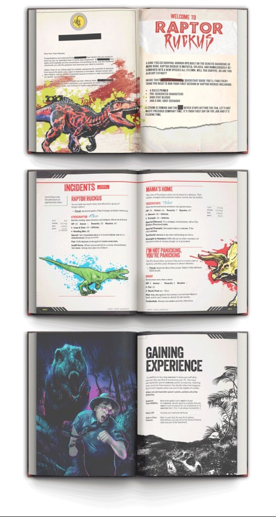 Raptor Ruckus is everything you need to play. It’s a Survival Horror Sourcebook with easily hackable ideas, tables, and tools for use in any RPG set where life is cheap in the modern era. It’s also an homage to vibes and storytelling from the 80s and 90s, especially stuff Dinosaur and monster stuff!