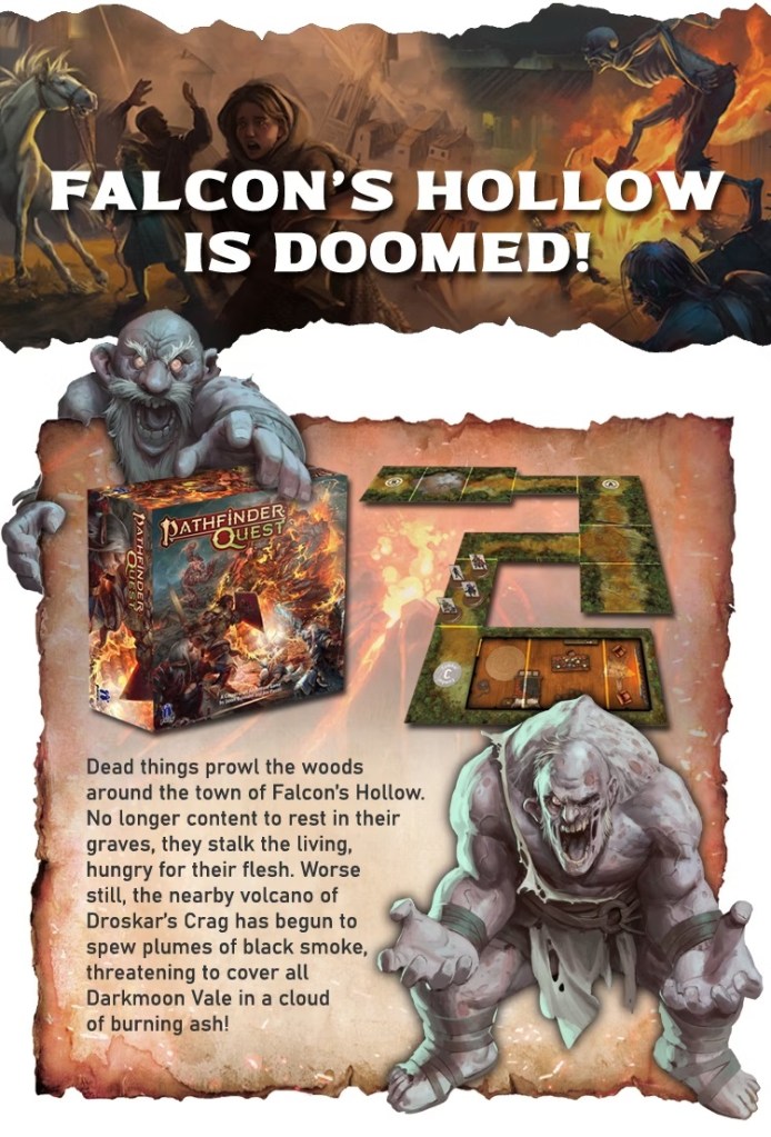 Dead things prowl the woods around the town of Falcon’s Hollow. No longer content to rest in their graves, they stalk the living, hungry for their flesh. Worse still, the nearby volcano of Droskar’s Crag has begun to spew plumes of black smoke, threatening to cover all Darkmoon Vale in a cloud of burning ash!