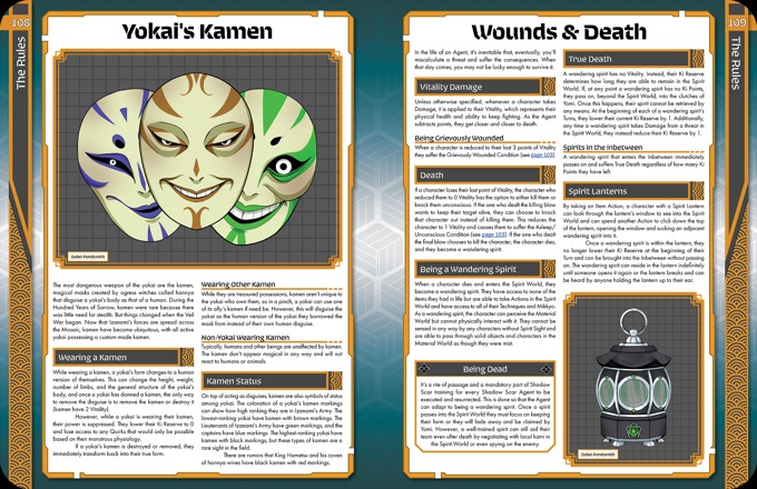 The Storyteller’s Guide: With all the system and lore in hand the next chapter is devoted to giving the Game Master, or the Storyteller, a little guidance on how to run Shadow Scar. This chapter includes tips and tricks from the lead designer, Cody Pondsmith, information on the factions that oppose the Agency, rules for building missions, and for bringing your own favorite worlds into the Veil War.