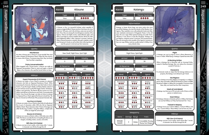 The Rogues Gallery: The next chapter is the Rogues Gallery, a bestiary of 40 entries detailing human threats as well as devilish yokai drawn directly from Japanese myth and legend. Each entry is presented on a single page with easily referenced statistics and abilities to make running combat encounters and infiltration easy. Among the many entries in the Rogues Gallery you’ll find filth licking akaname, brutish and powerful oni, treacherous kitsune, mind-reading Satori, and even the unassuming karakasa-obake.
