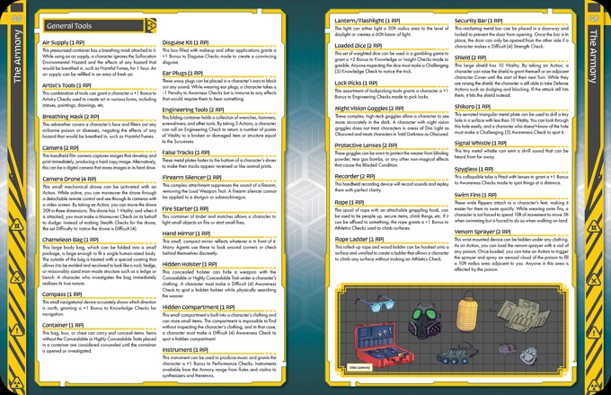 The Armory: The next chapter is one of the most important, the Shadow Scar Armory. Here you’ll find 12 pages of weapons, outfits, drugs, poisons, explosives, disability aids, tools, and magical artifacts that you can requisition from the Agency to use on your missions.