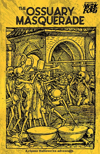 The Ossuary Masquerade is a MÖRK BORG adventure that was designed for Hallwe’en but that can work for any campaign as the end of days approaches. It follows a fairly predictable plot where a powerful spirit decides that Hallowe’en should last forever, and thus consumes the sun.