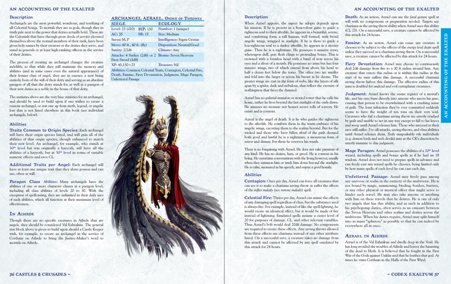 With Exaltum you have more than sixty celestials beings use in your game. Each vividly described and each accompanied by an illustration. This provides ample fodder for any gamemaster to explore and introduce clestial beings and events into the game.