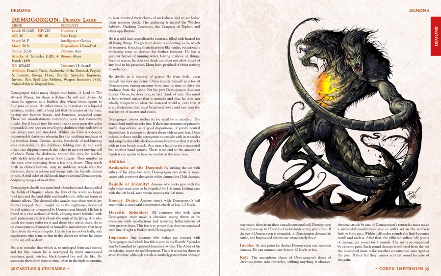 This is the Codex Infernum, a catalog of hundreds of demons and devils. Within these pages you’ll find everything you need to know about arch, greater, lesser and minor devils. With that comes all you’ll need to know about the demon lords, and the major, lesser and minor demons. Hundreds of entries, each depicted in glorious color.