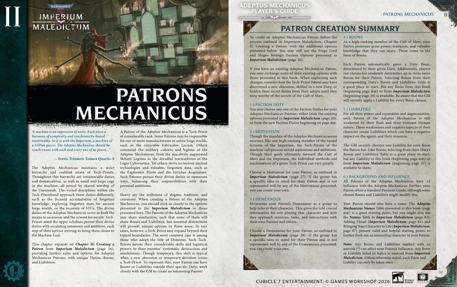 - The Priesthood of Mars: Build unique Patrons drawn from across the Adeptus Mechanicus’ hierarchy. Create a wide variety of Tech-Adept characters to start your adventures.