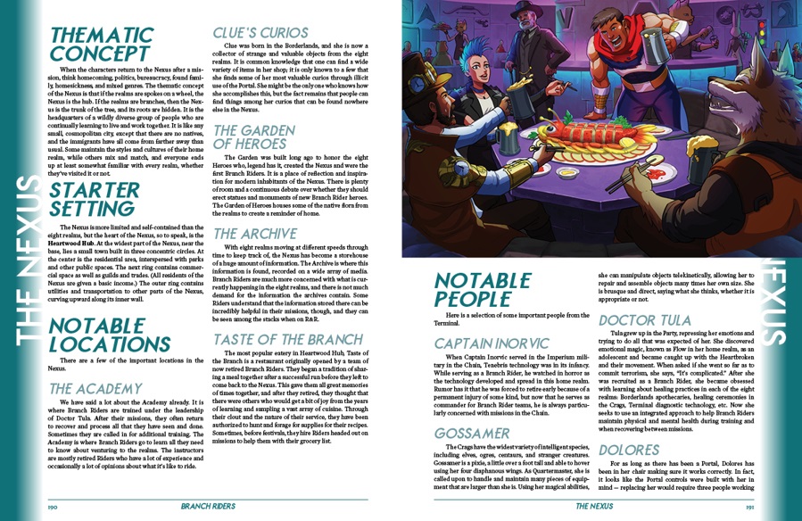 In Branch Riders, Riders, you take on the role of a brave adventurer who can travel between eight distinct realms, separated to contain a malevolent and devious force — the Blight. This force seeks to throw all the inhabitants of the eight branch realms, as well as the dimensional Nexus of all the branches, into misery and conflict by any means at its disposal. You will use your skills and gifts and the combined strength of your teammates to seek out, understand, and thwart the Blight. Your identity and mission are secret and must not be revealed or the very curtain that protects the realms will be torn asunder, unleashing a united Blight upon us all!