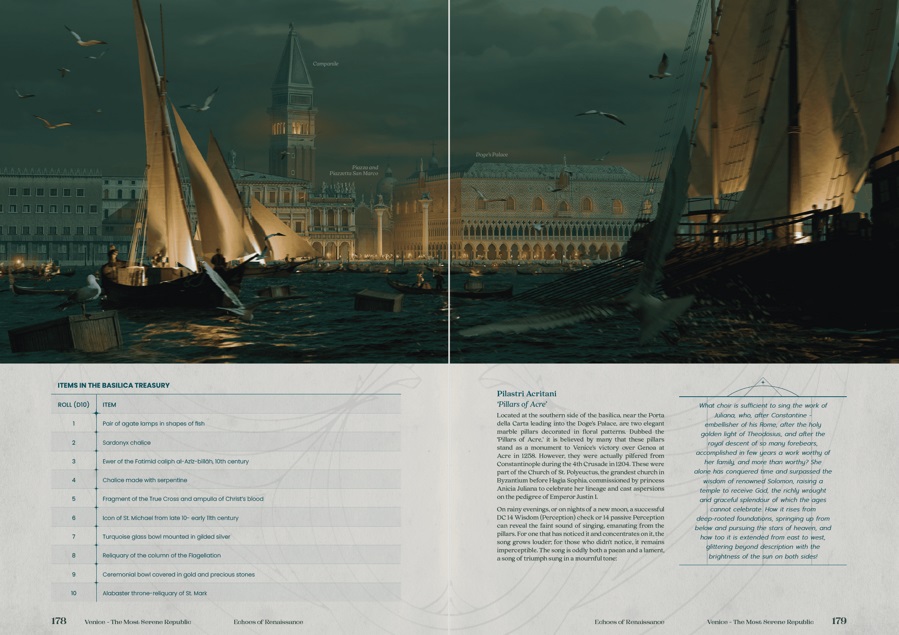 Echoes of Renaissance is the definitive setting guide for 5th edition adventures in 16th-century Venice. Within this setting guide you will find: