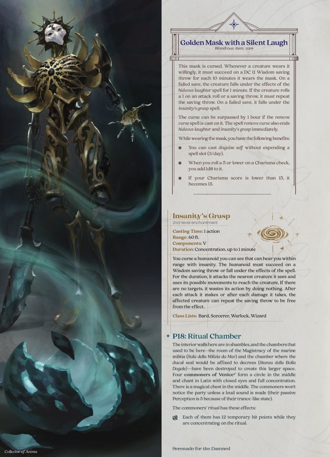 In this gyre of intrigue and darkness, shadowy faces don masks, light up the stage, and prepare for the grand crescendo of their show–a vengeance decades in the making. Will the adventurers, thrown together by circumstance, be enough to stop the flood of madness threatening to overtake Venice?