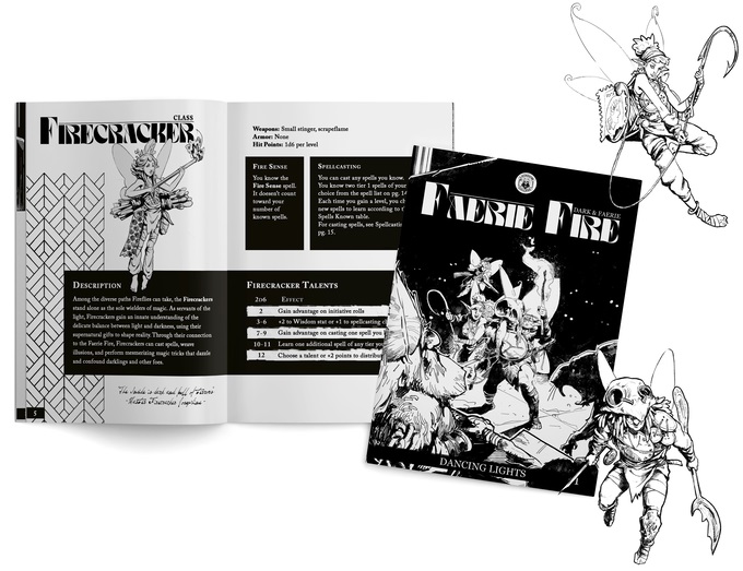 Faerie Fire – Issue #1 – Dancing Lights is a 60-page RPG Zine filled with fine black and white illustrations bringing its dark setting to life, New Classes and Features to create your Firefly scavenger, and a full set of tools and tables for running a game through the darkness of the lost world of the Tall Folk.