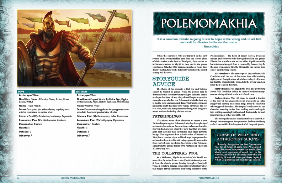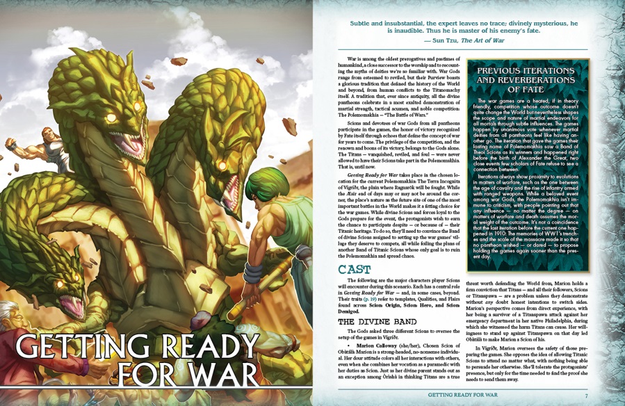 War Games is an adventure for Titanic Scions of Hero and Demigod levels of play in which the players will have the choice between proving that Titanic Scions have a place in the Polemomkhia and have a chance to win it or will ally with other Titanic Scions to destroy this most recent iteration of the institution. Either choice the band makes will affect the state of the Second Titanomachy to come. It also includes story seeds for related adventures at Origin and God levels of play, as well as RMCs for Titanic Scions at Demigod level.