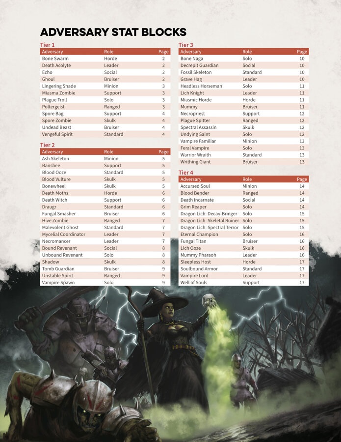 At least one adversary is included for each Role at each Tier. For example, there is a Tier 1 Solo (the Plague Troll), a Tier 2 Solo (the Vampire Spawn), a Tier 3 Solo (the Bone Naga) and a Tier 4 Solo (the Mummy Pharaoh). This lets you compose varied encounters against undead at every tier of play.