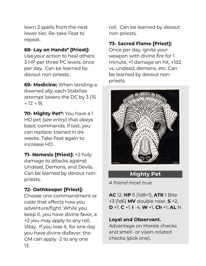Feats offer focused, flavorful abilities that rarely overshadow core class features and give characters memorable edges at every even level. They were crafted with care not to overlap existing talents or spells and to stay true to the gritty, low-powered feel of Shadowdark–badass normal, not superheroic.