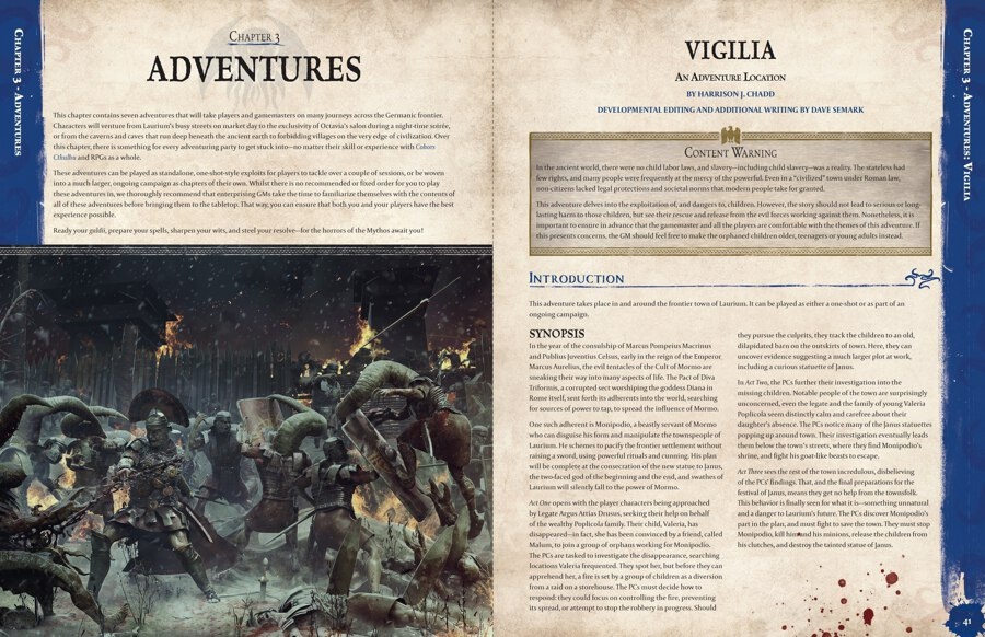 Other hidden forces—far more sinister—threaten all who live in Laurium, be they Roman, German, or from other cultures that have come to this place from afar. The lands near Laurium hide many secrets, including a rising swell of Mythos forces eager to corrupt this town. Dark cults lurk both within and outside its palisade walls, serving forgotten and malevolent gods whose goals imperil all of humanity. The few mortal groups knowledgeable enough to oppose such enemies also hide in Laurium, pretending to live ordinary lives while secretly locked in the Hidden Wars.