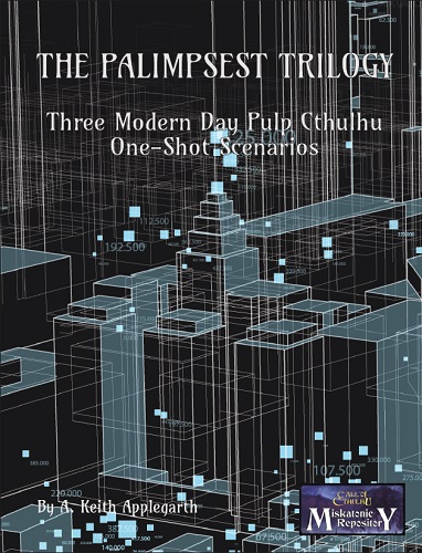 THE PALIMPSEST TRILOGY is three modern-day Pulp Cthulhu one-shot scenarios for 4–6 investigators. Each runs in 3.5–4 hours as a standalone, or they chain into a tight three-session mini-campaign where each outcome visibly shapes the next scenario.