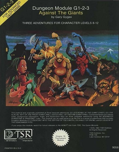 This material was originally published as three separate adventures: G1: “Steading of the Giant Chief”; G2: “The Glacial Rift of the Frost Giant Jarl”; and G3: “Hall of the Fire Giant King.” Contained herein are referee notes, background information, maps, and exploration keys for three complete adventures using the Advanced Dungeons & Dragons rules.